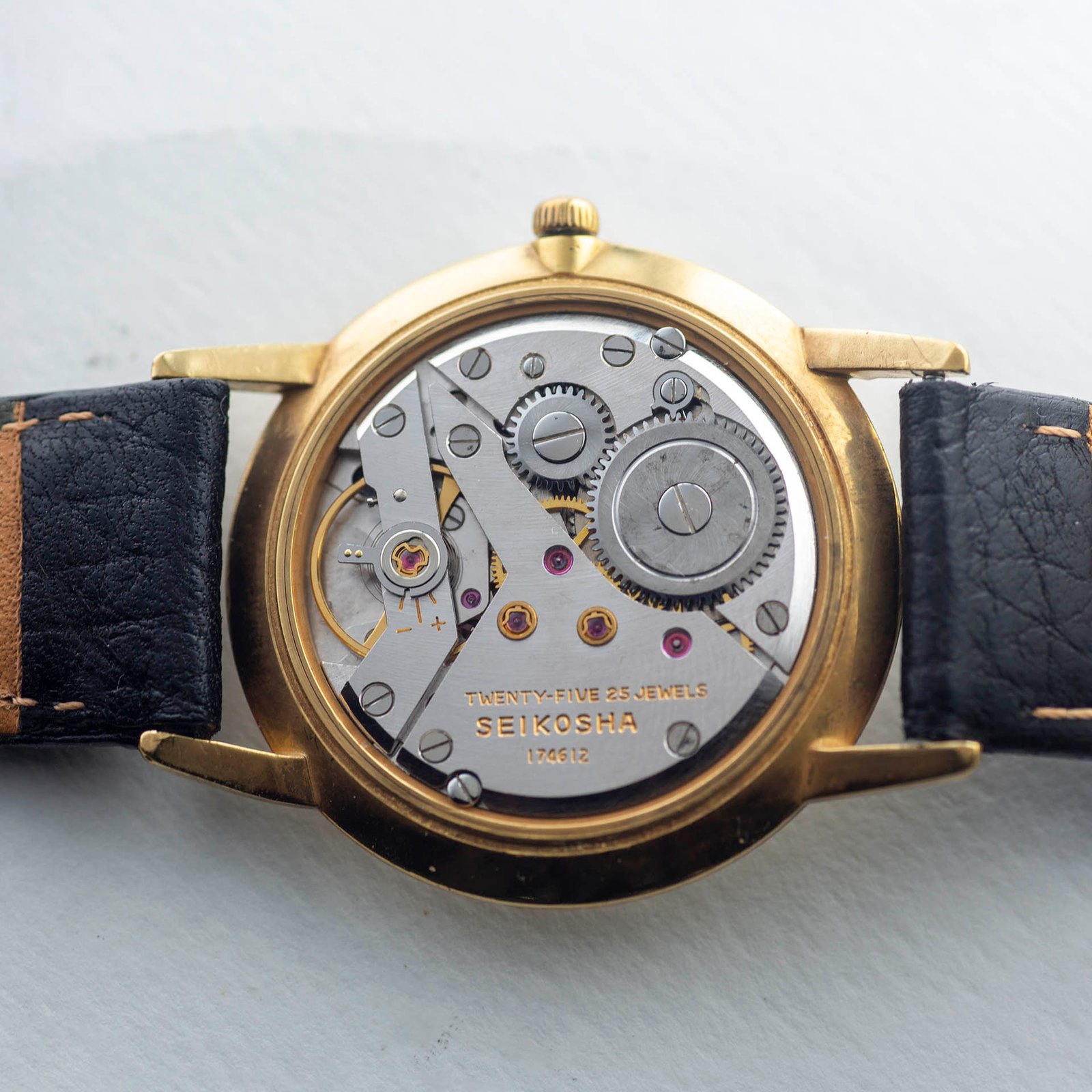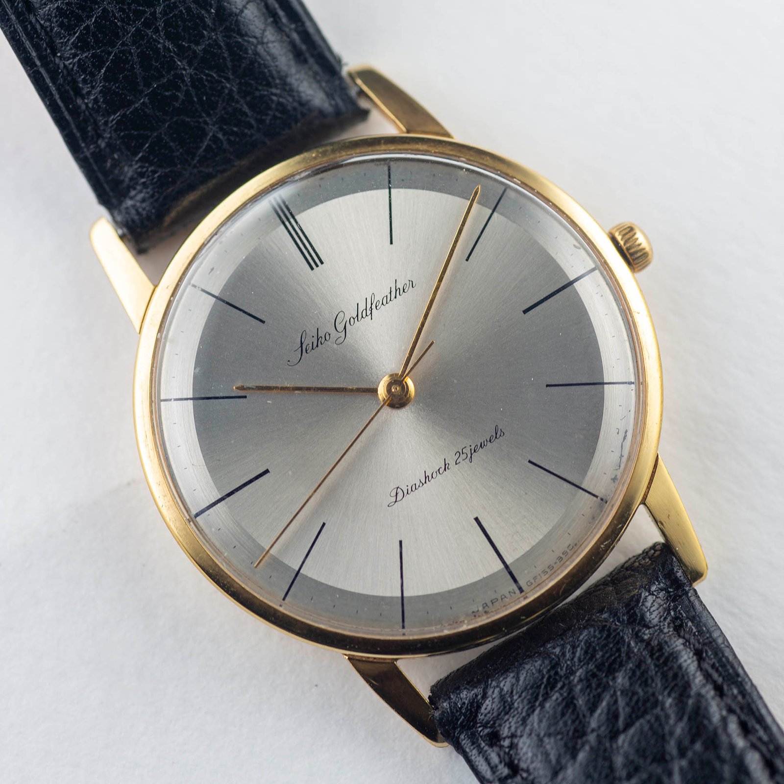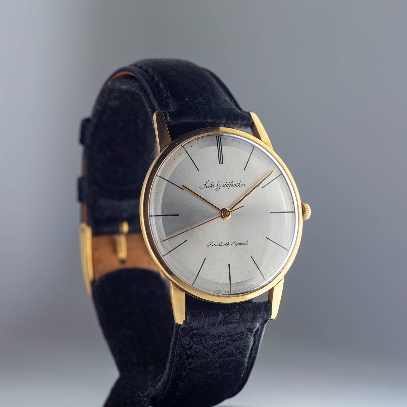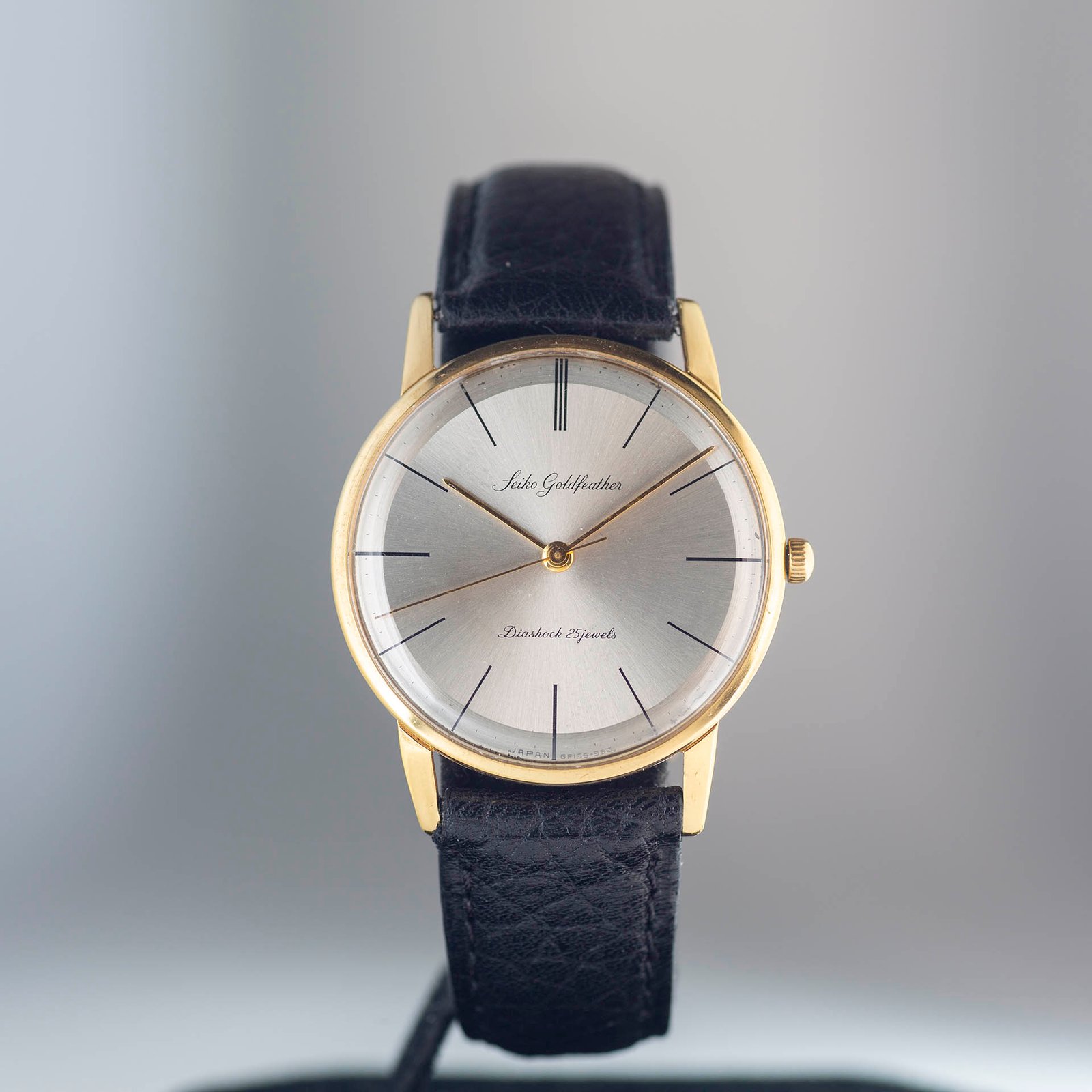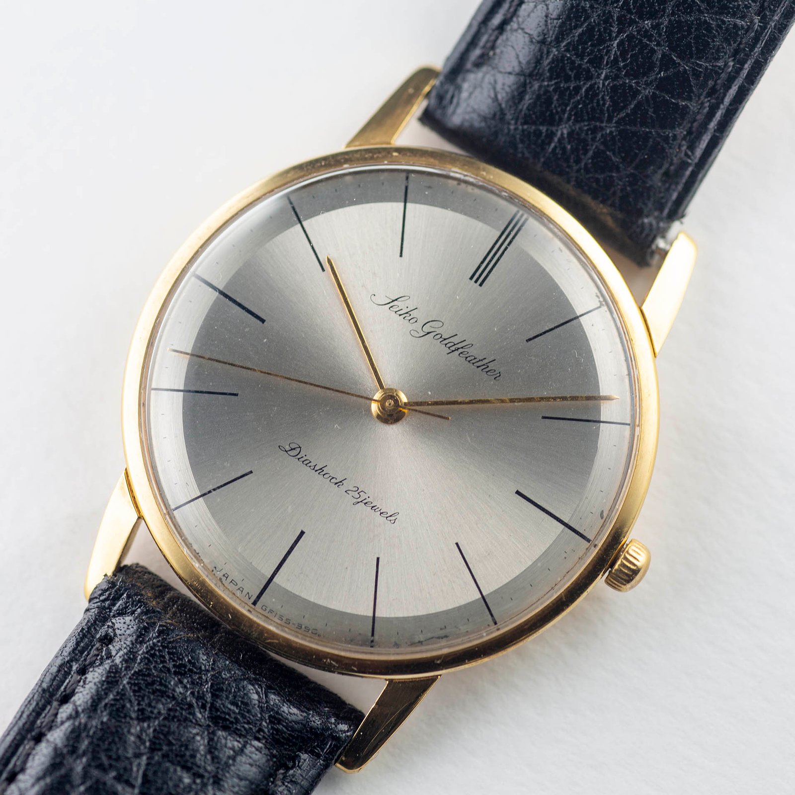 The Goldfeather was made at a time when movements were assembled and regulated largely by hand and still labelled under Seiko’s old name, “Seikosha.”