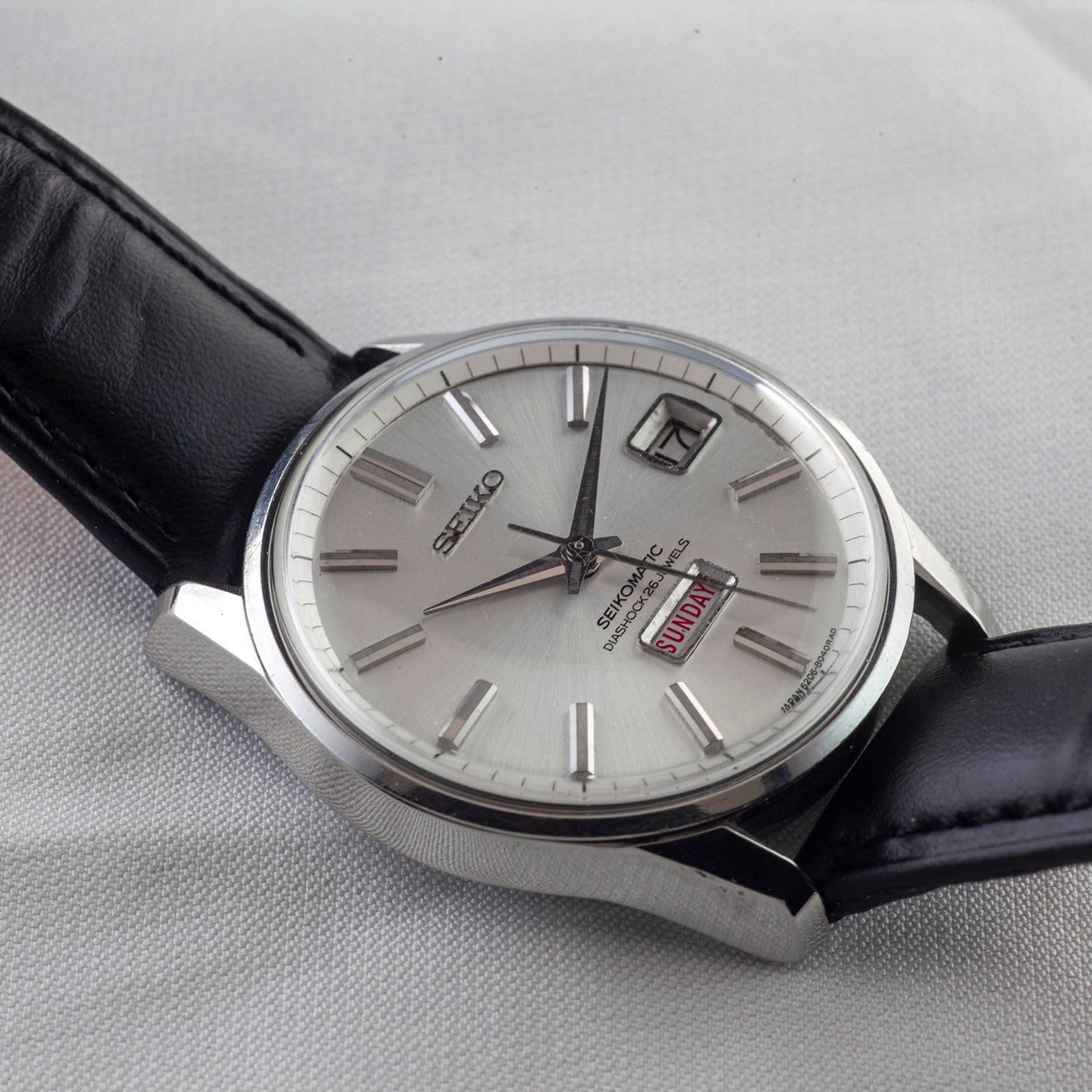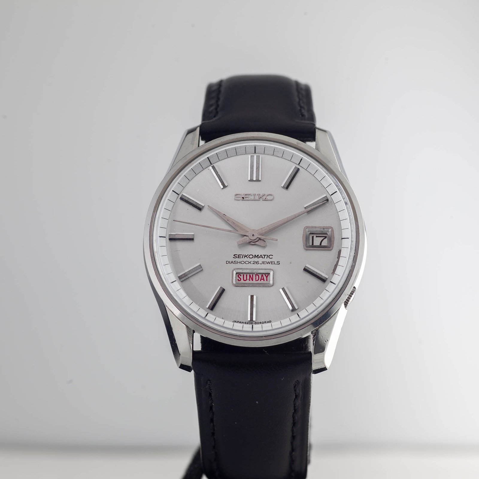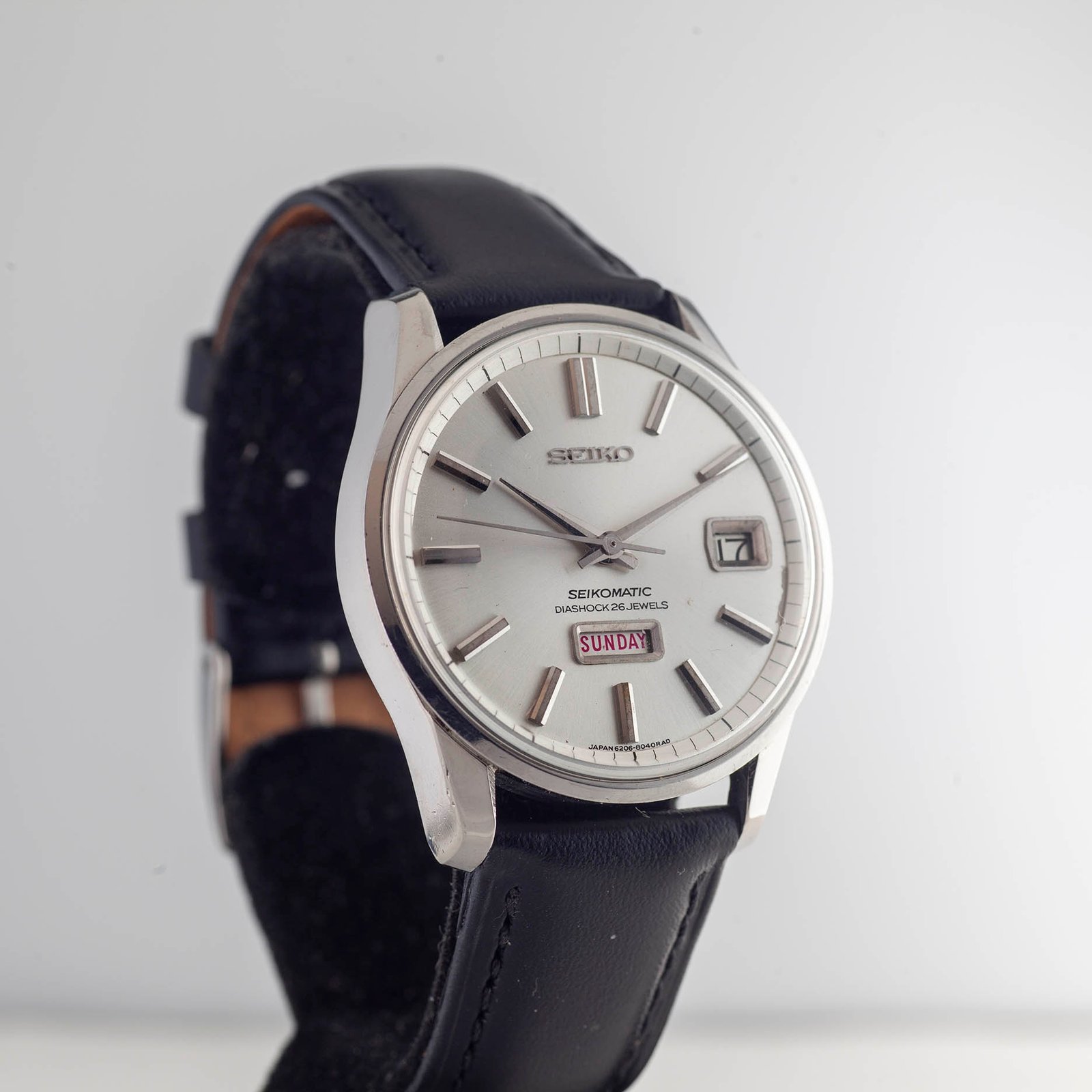 The Seikomatic line was Seiko’s flagship for automatic‑winding mechanical watches throughout the 1960s. Built by Suwa Seikosha, the caliber 62 family represented a major step forward in Seiko’s pursuit of precision and reliability. The Weekdater models, such as this 6206‑8040, combined everyday practicality with refined mid‑century design.